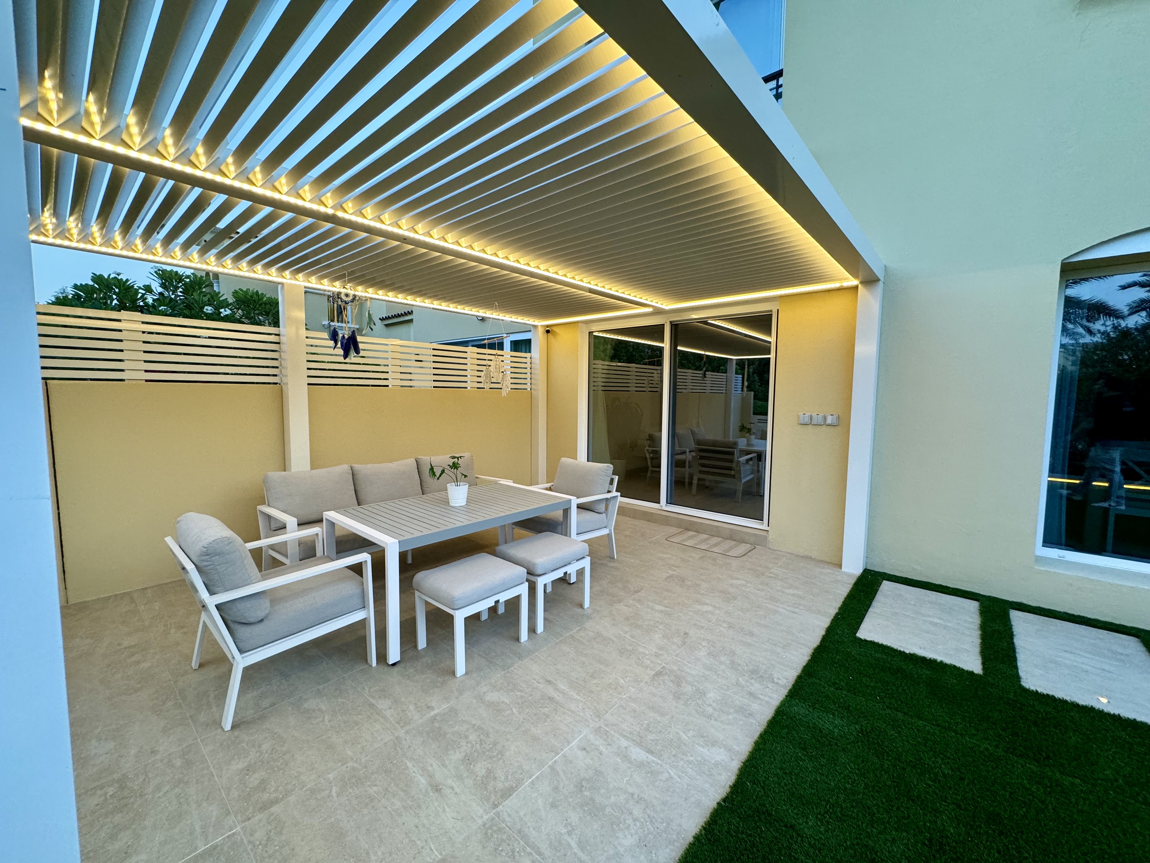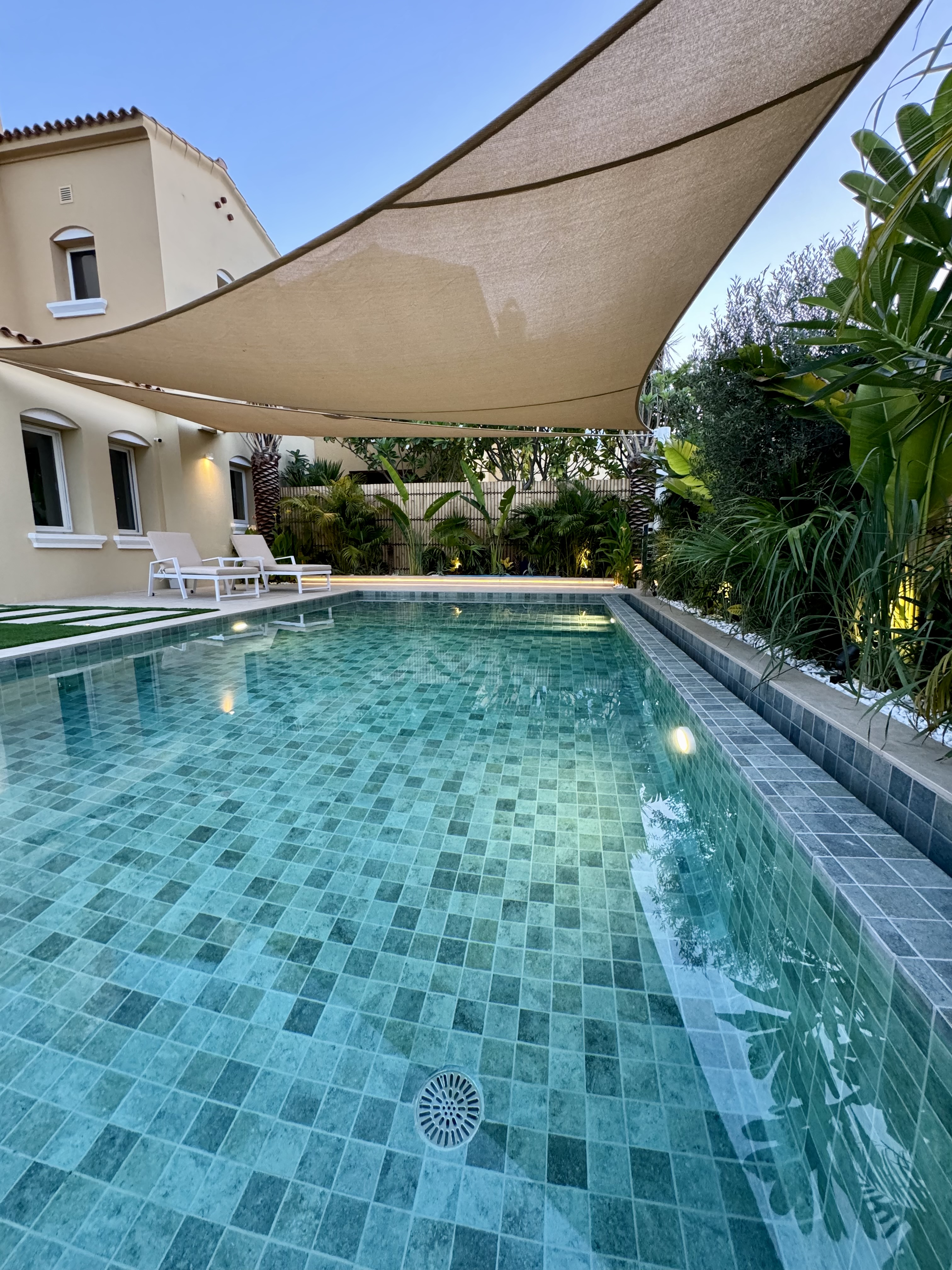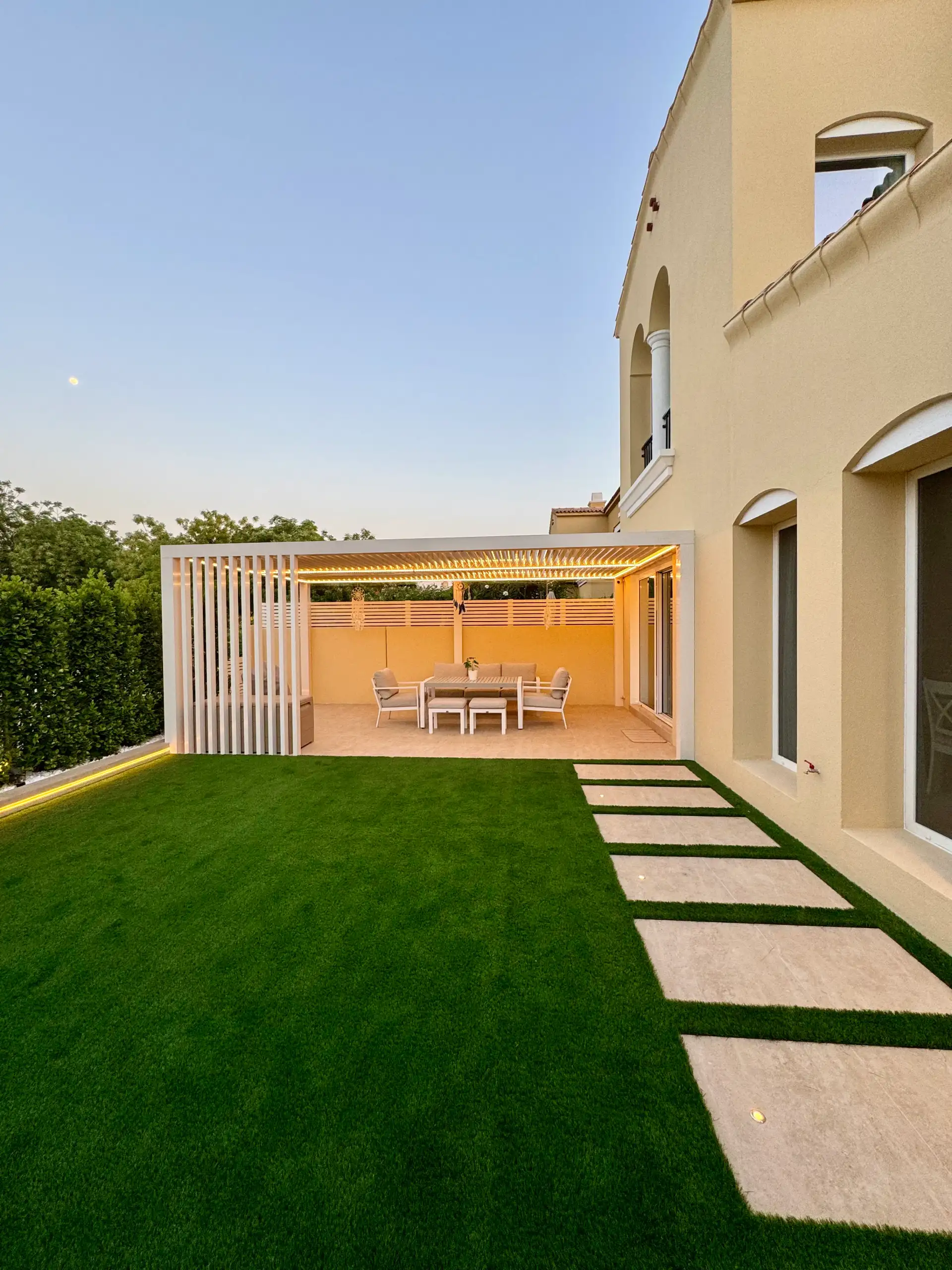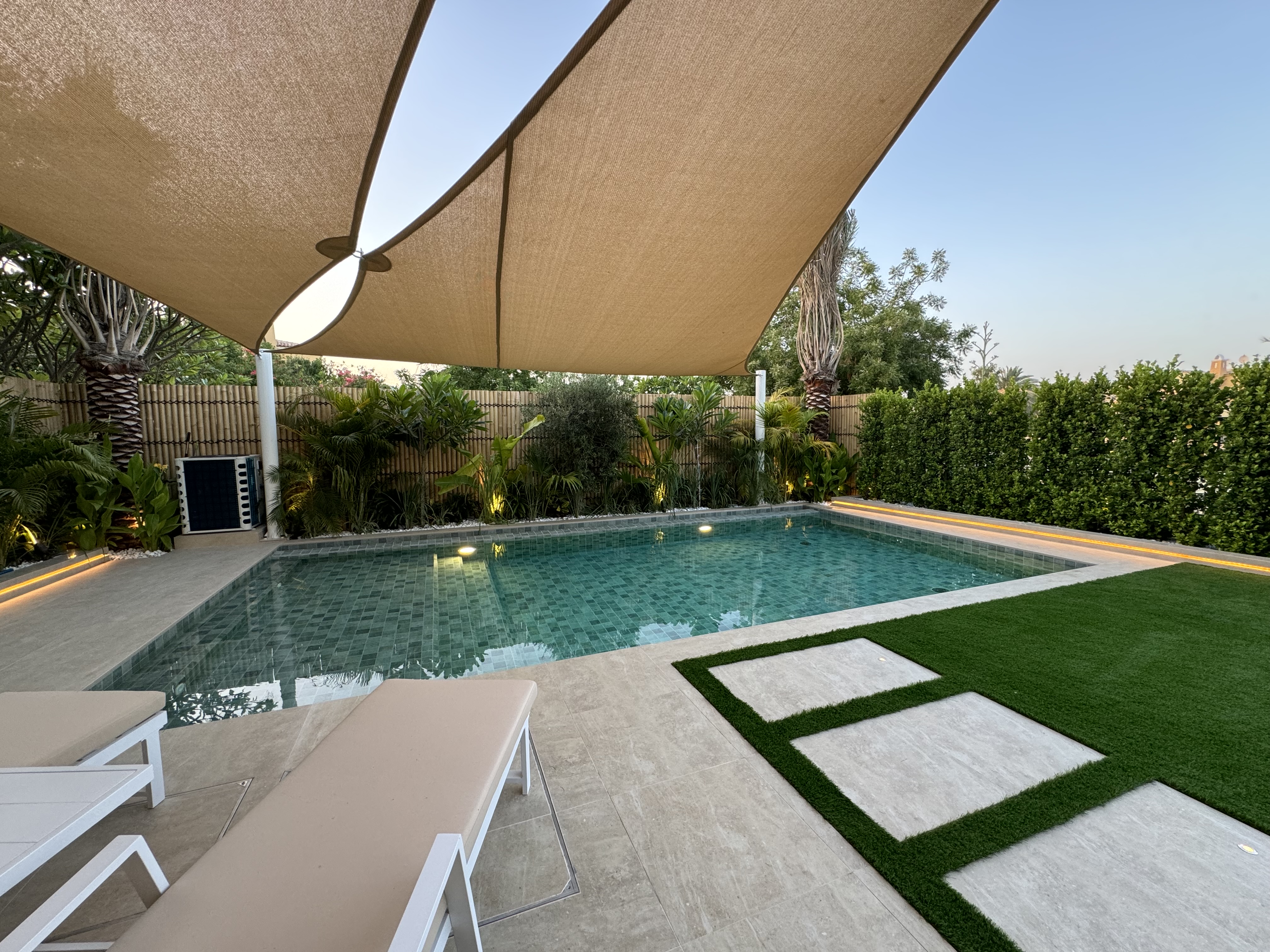 An outdoor retreat featuring a custom swimming pool, lush landscaping, and a stylish pergola seating area. Designed for comfort and leisure, this backyard is the perfect escape.
